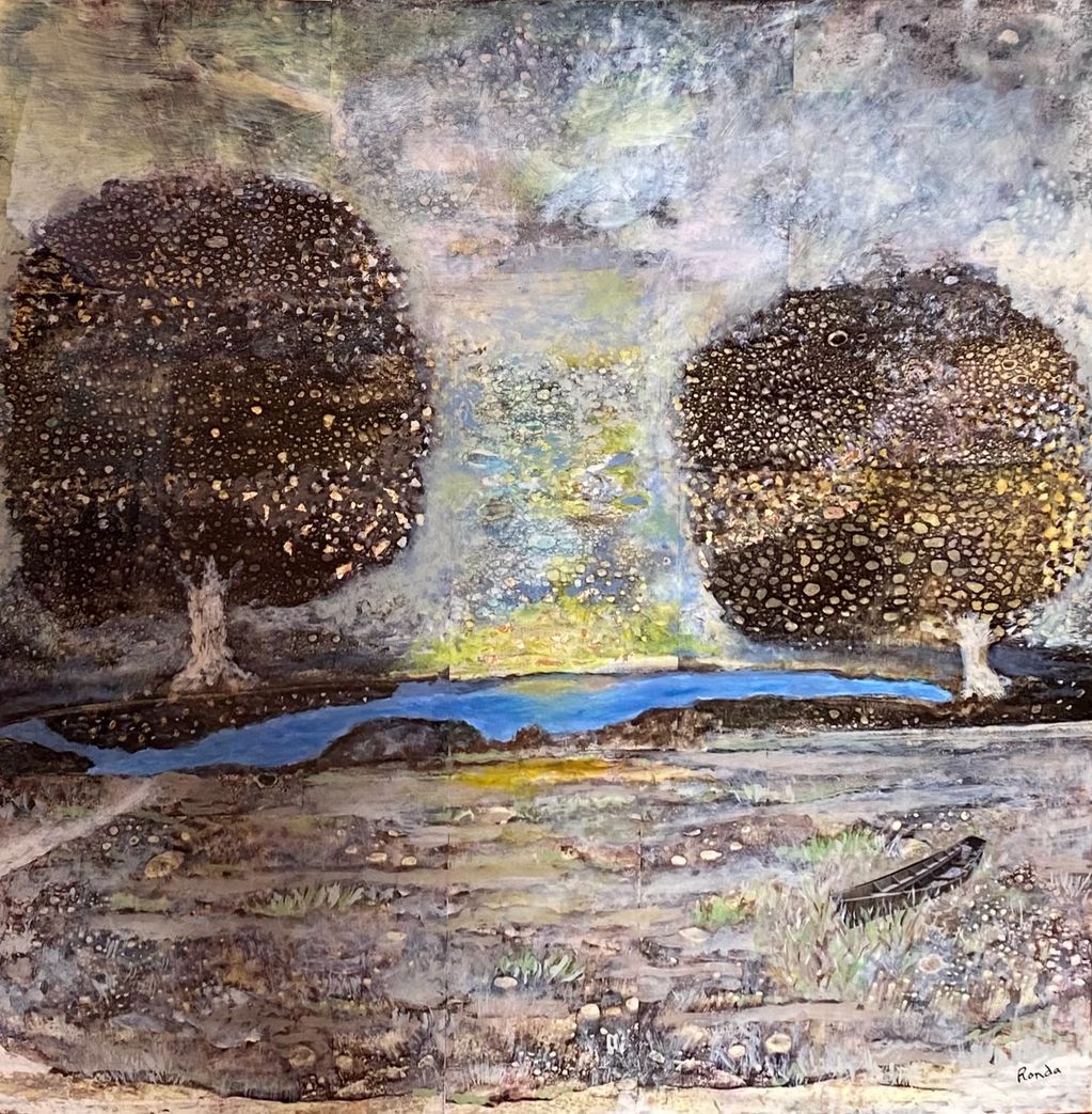 10"h x 10"w - mixed media on wood panel, resin finish (1/2"d)
